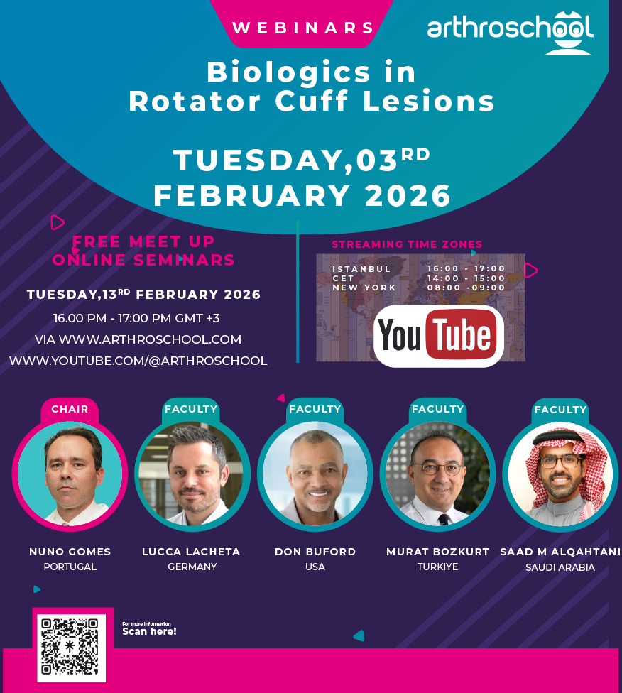 Join ArthroSchool for an in-depth live webinar focusing on the current concepts, evidence, and clinical applications of biologics in rotator cuff pathology. This expert-led session will explore how biologic therapies are shaping both non-operative and surgical management of rotator cuff lesions.